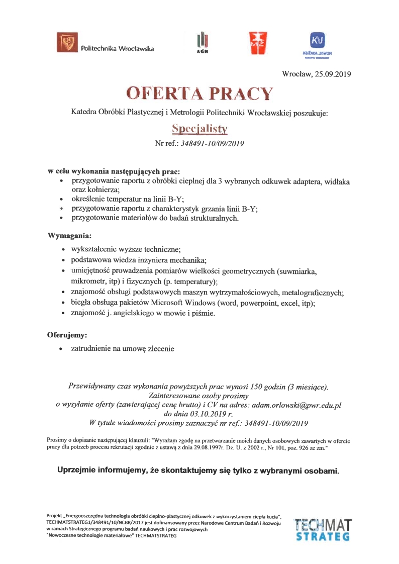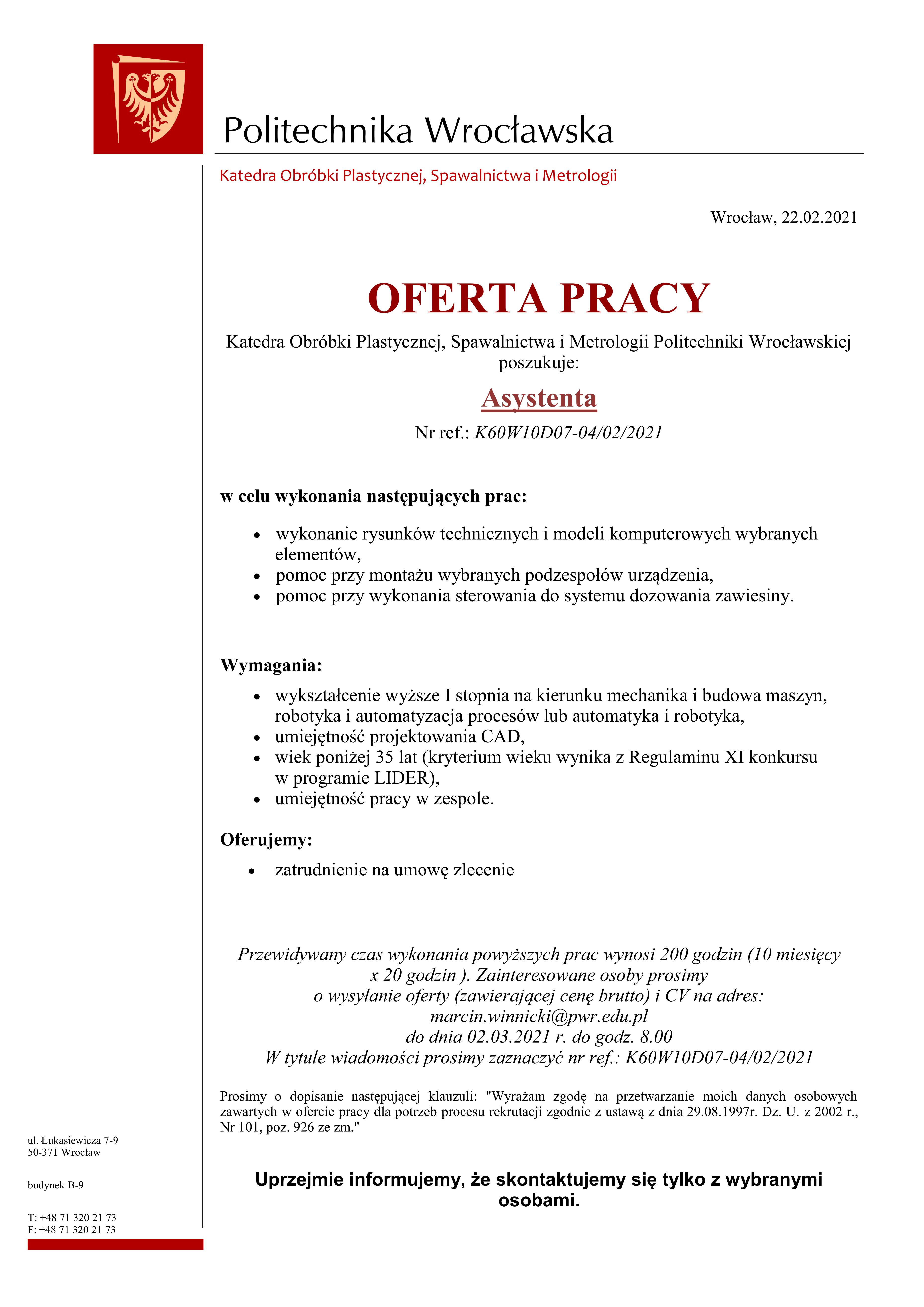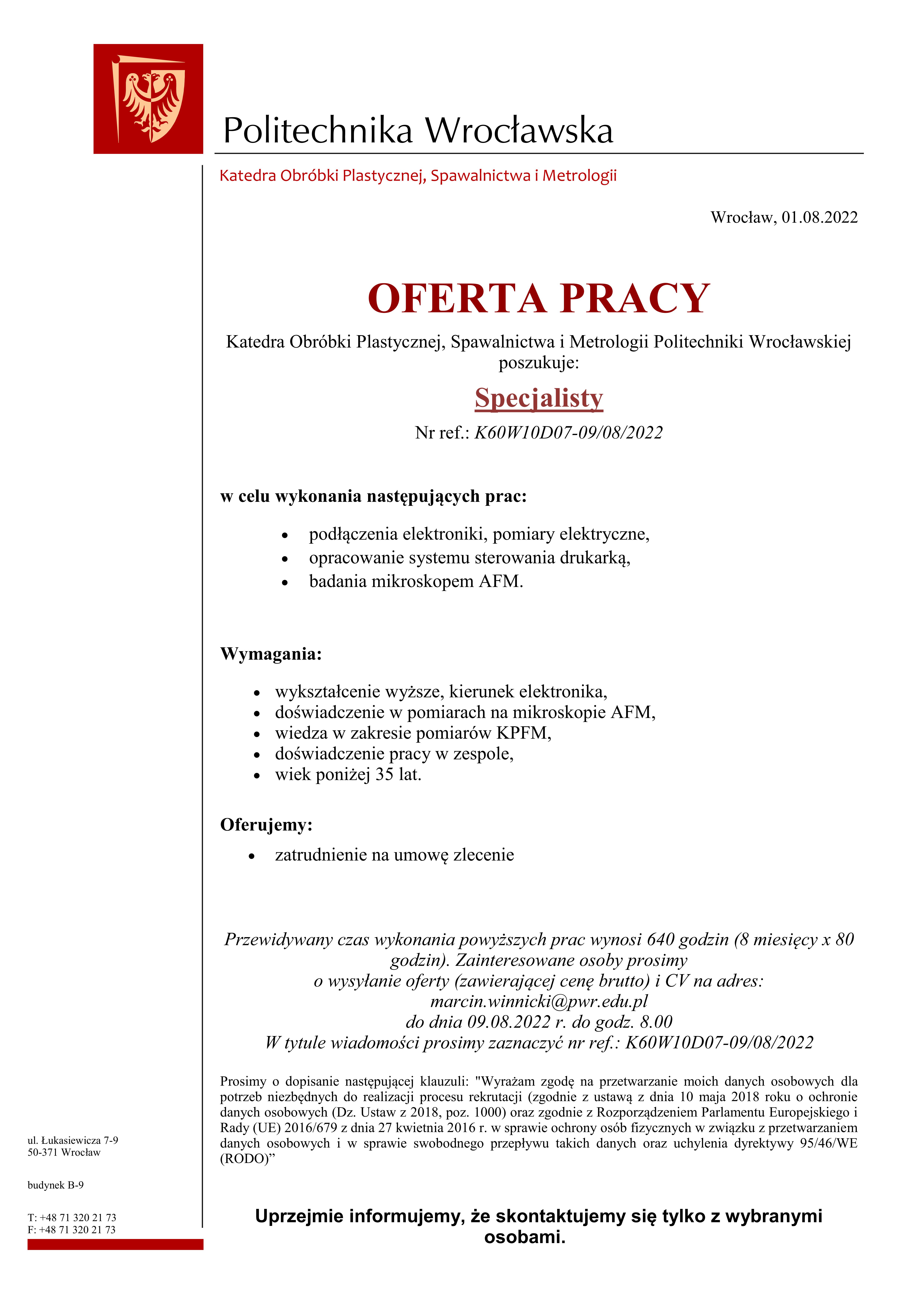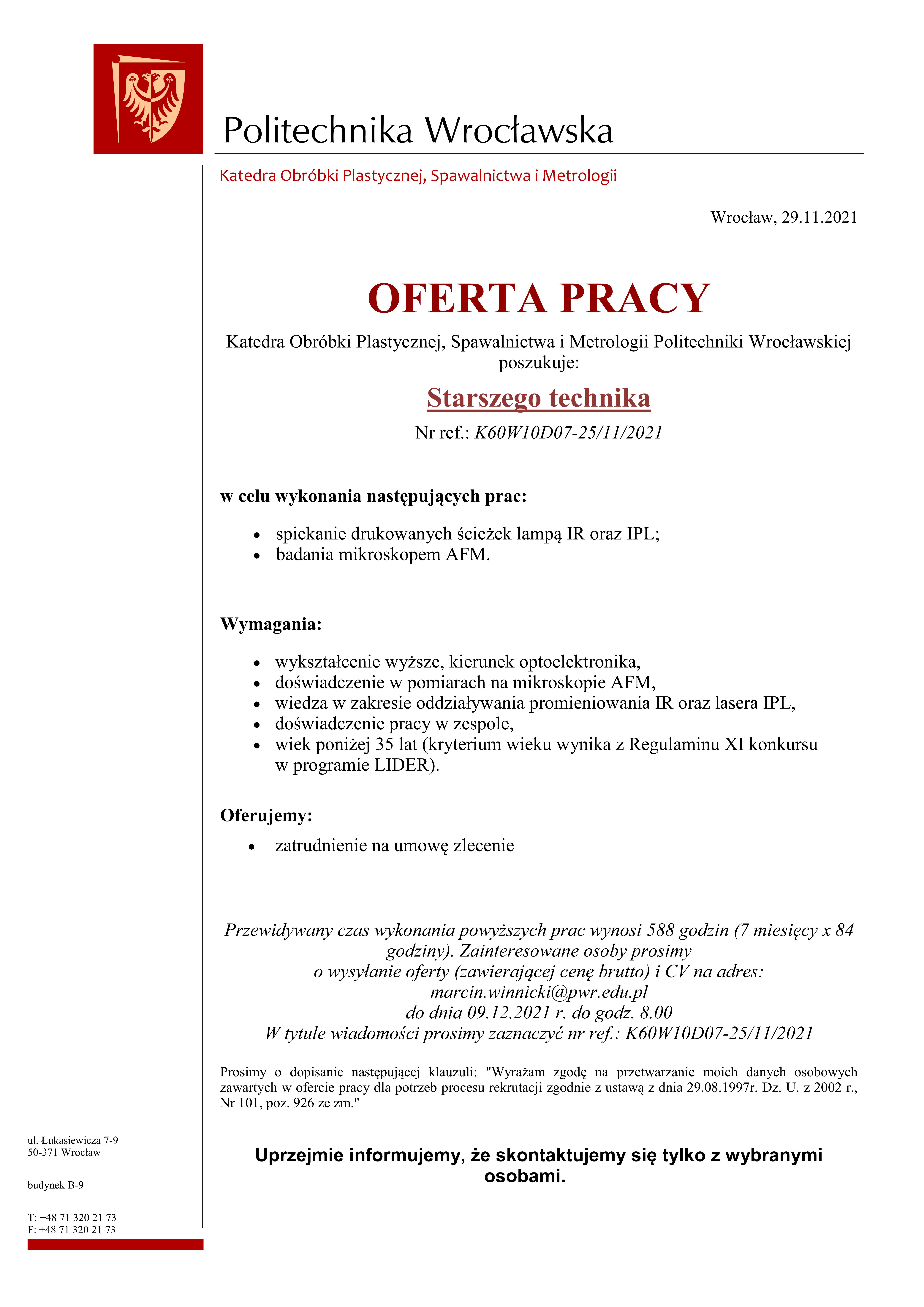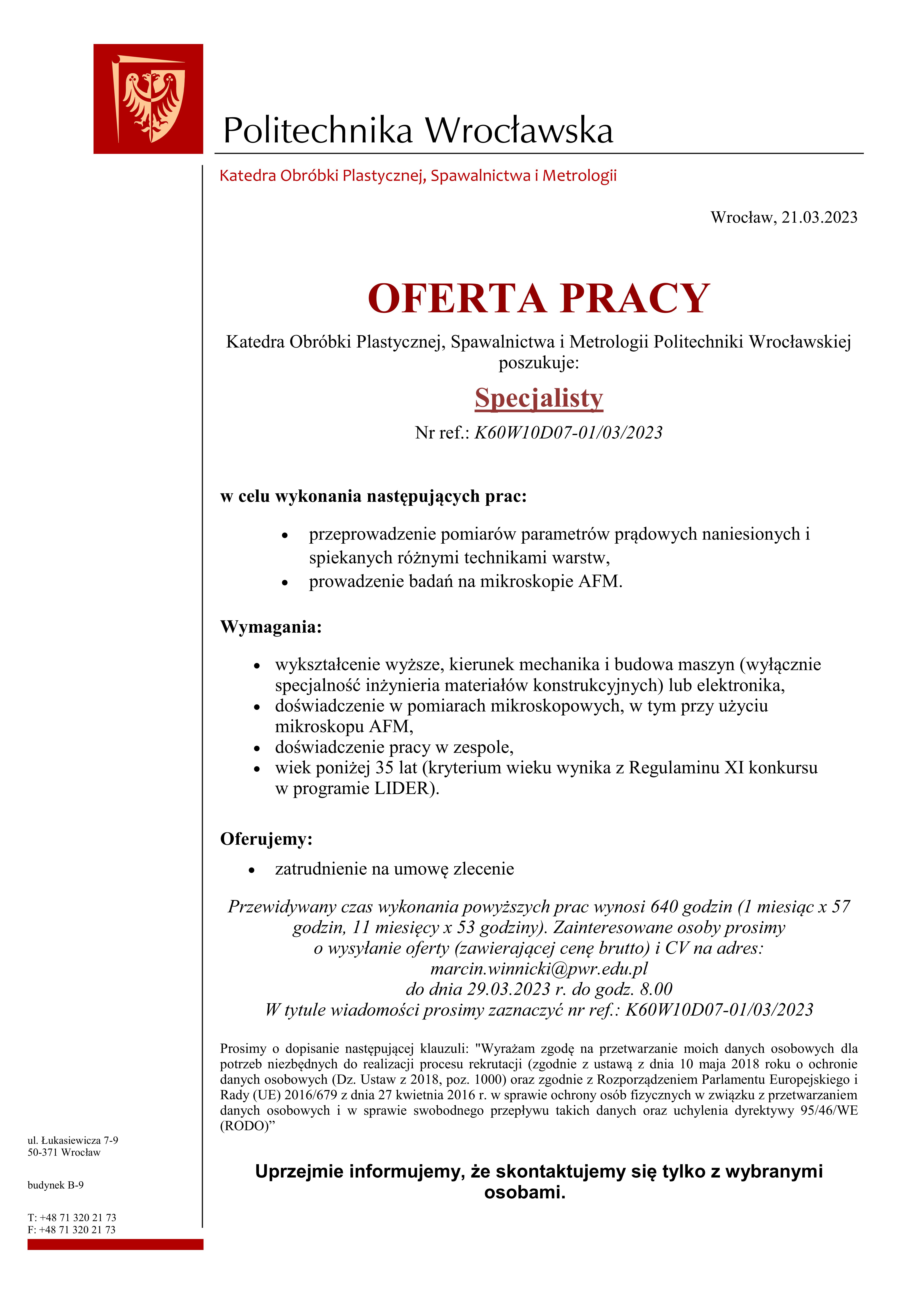 Oferty pracy w Katedrze Obróbki Plastycznej i Metrologii