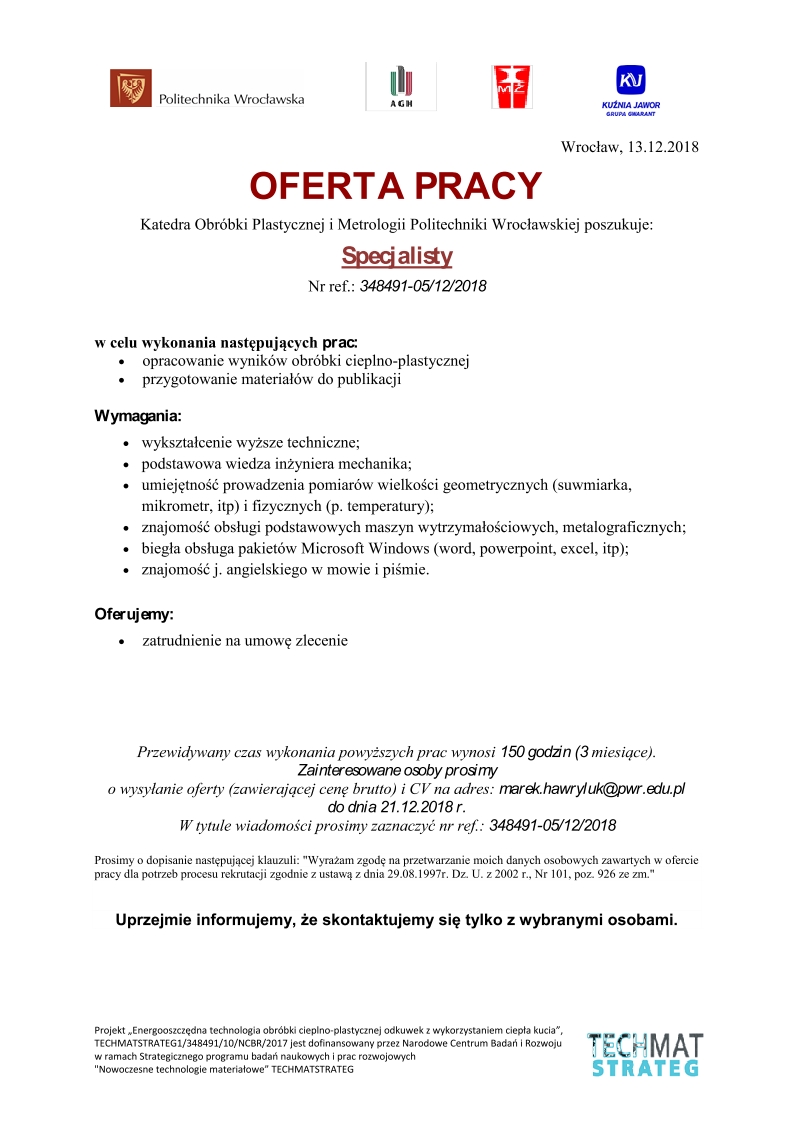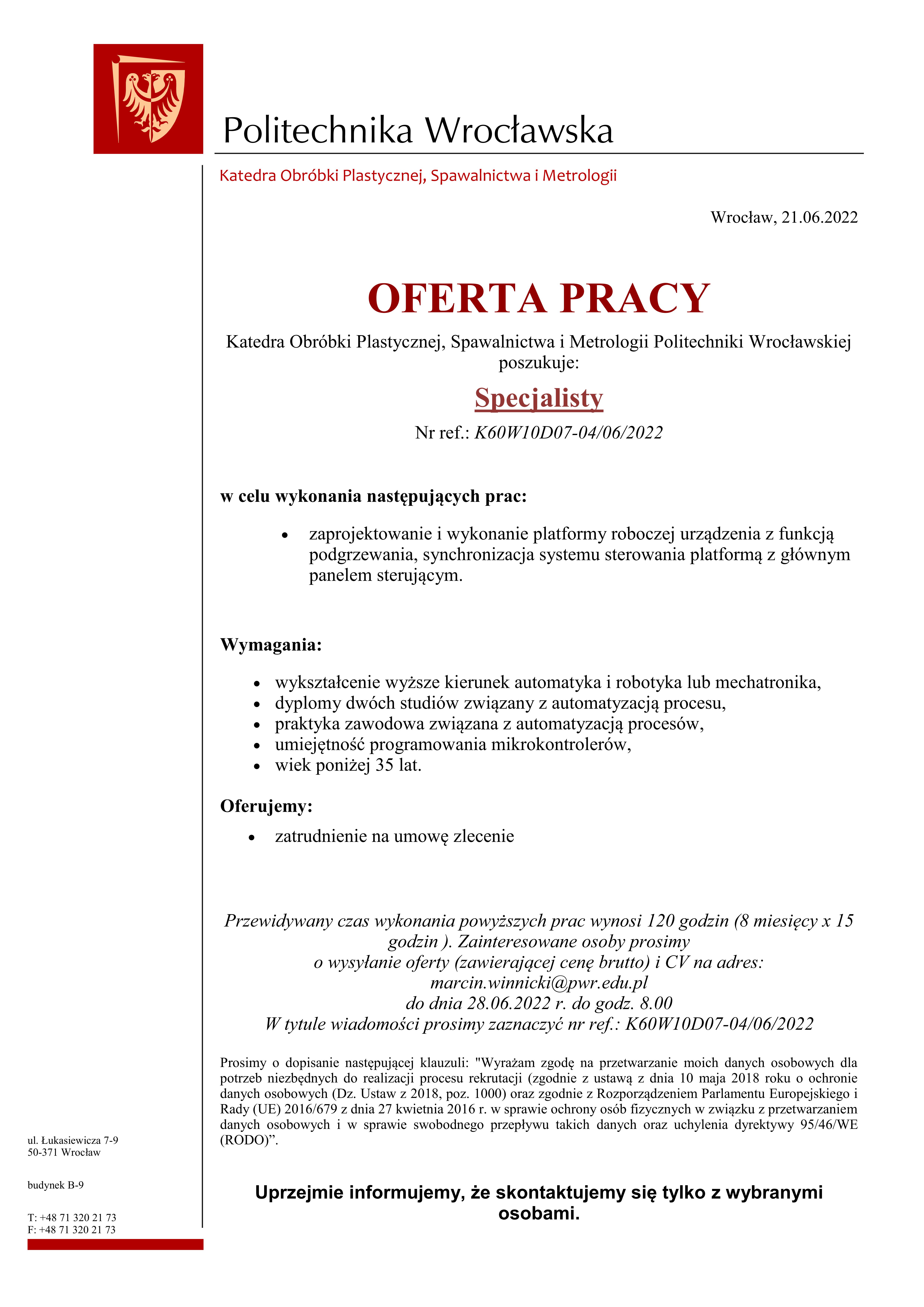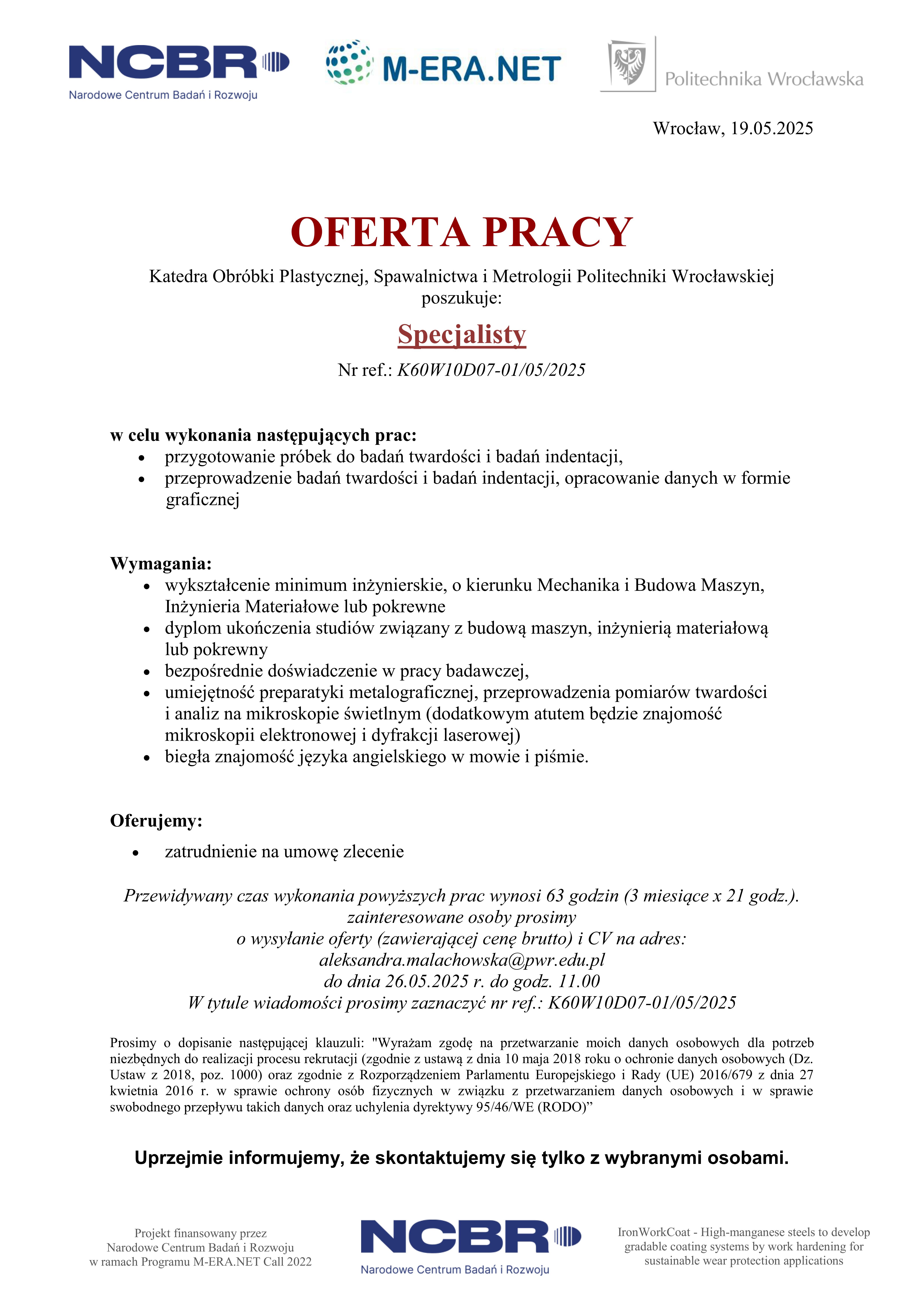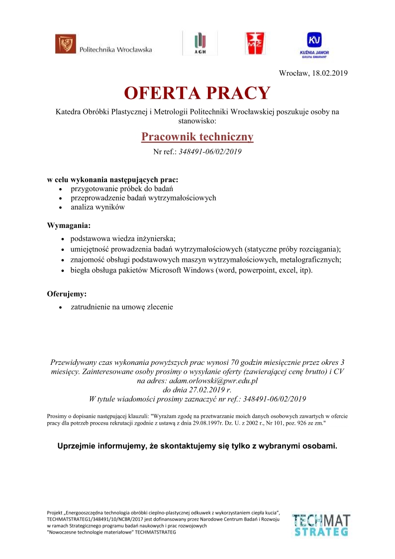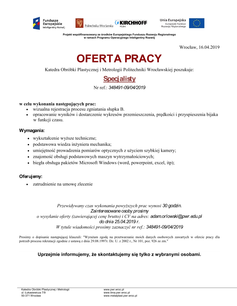 Oferty pracy w Katedrze Obróbki Plastycznej i Metrologii