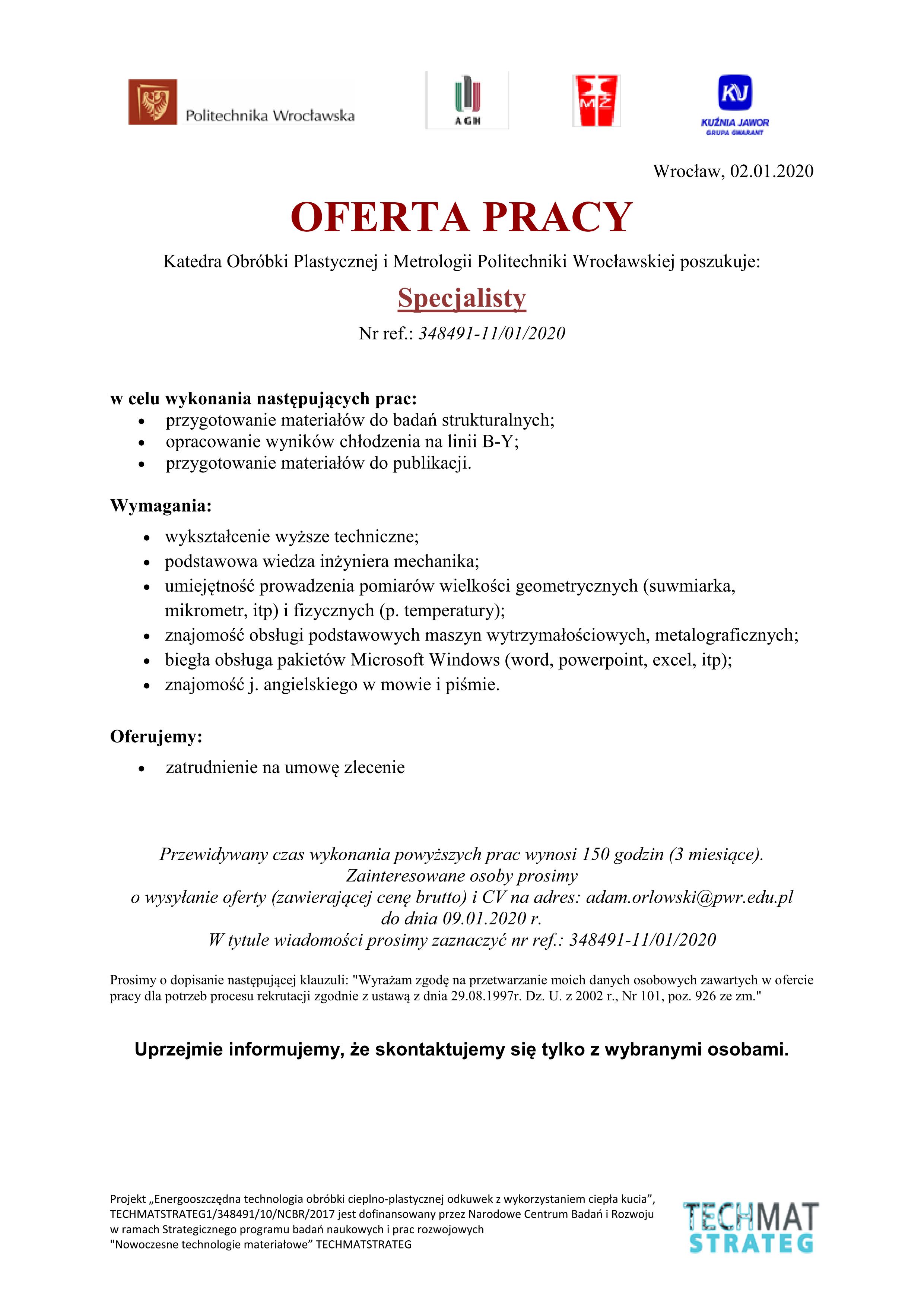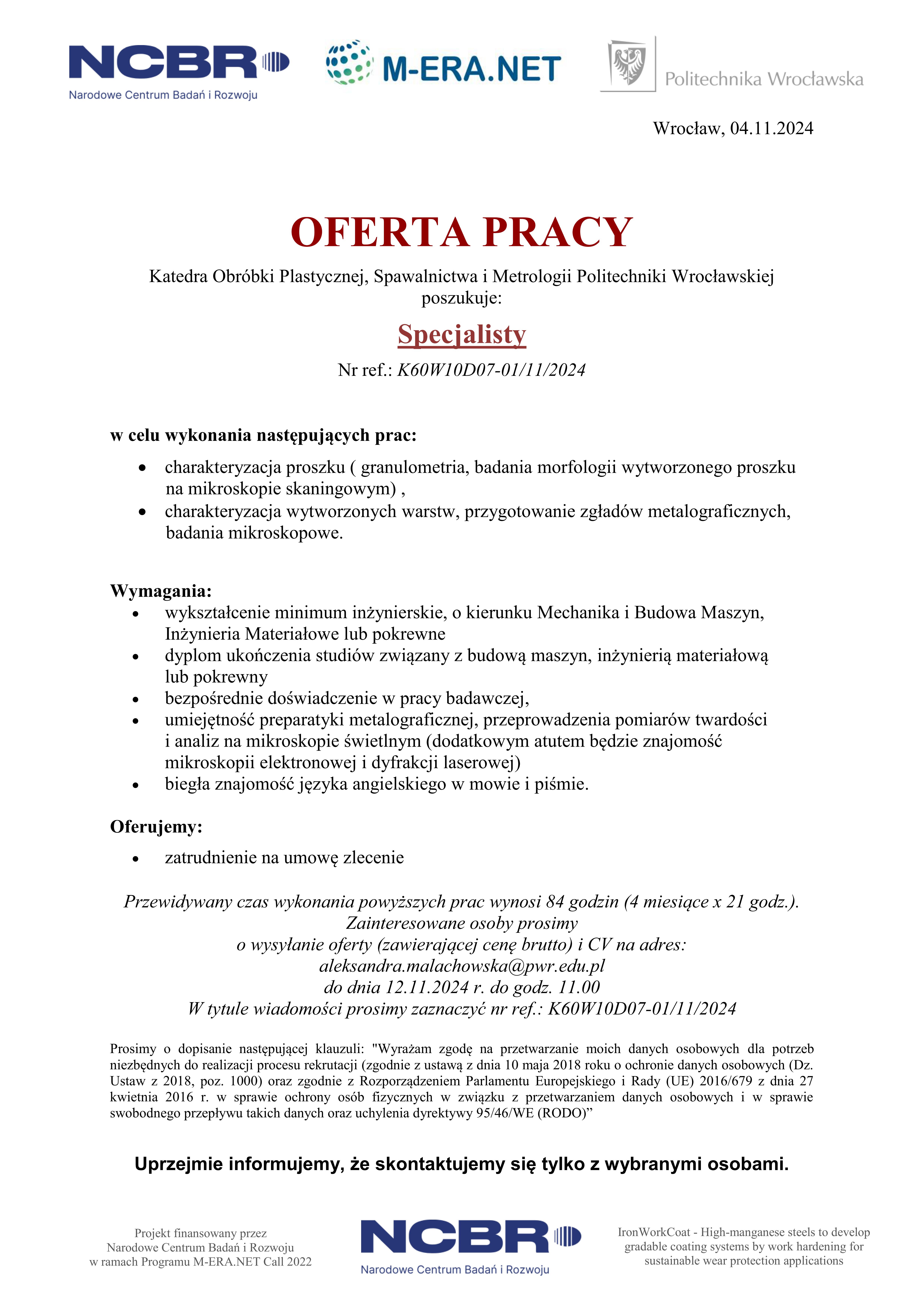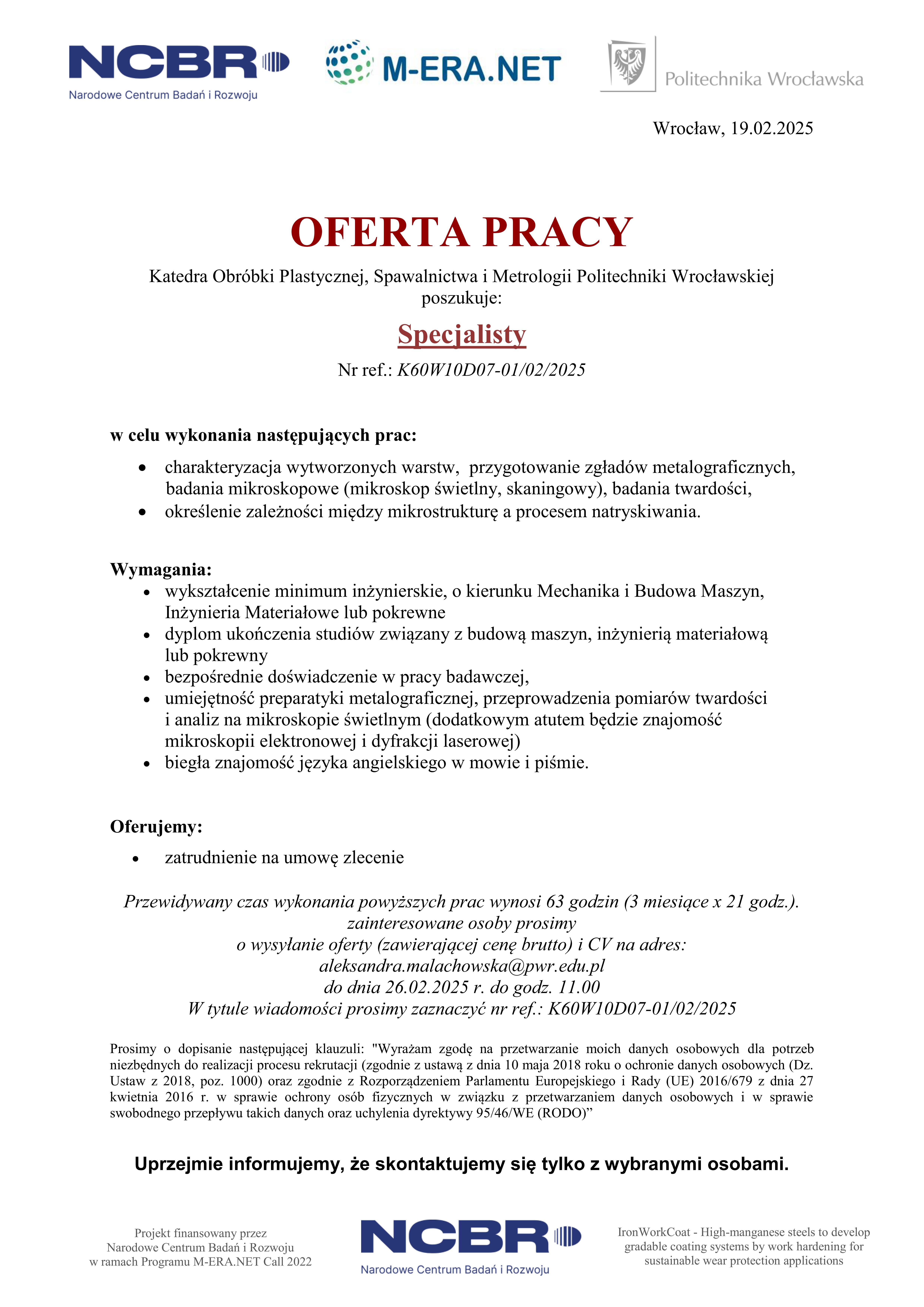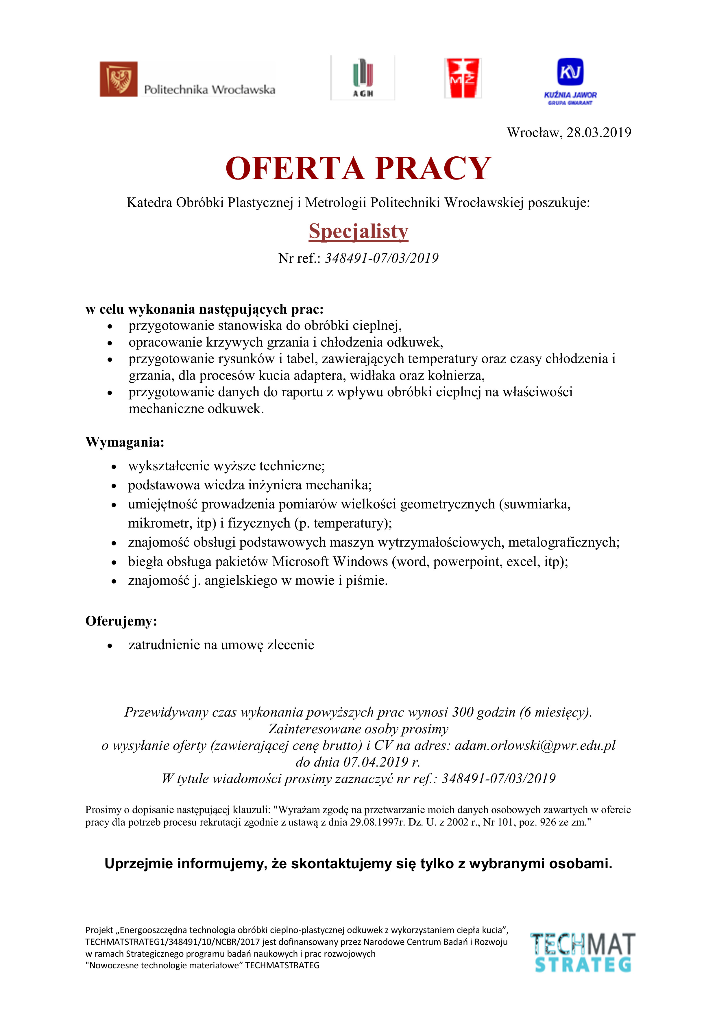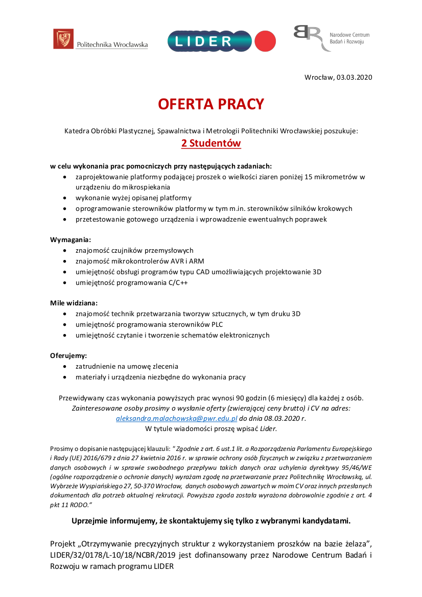 Oferty pracy w Katedrze Obróbki Plastycznej i Metrologii