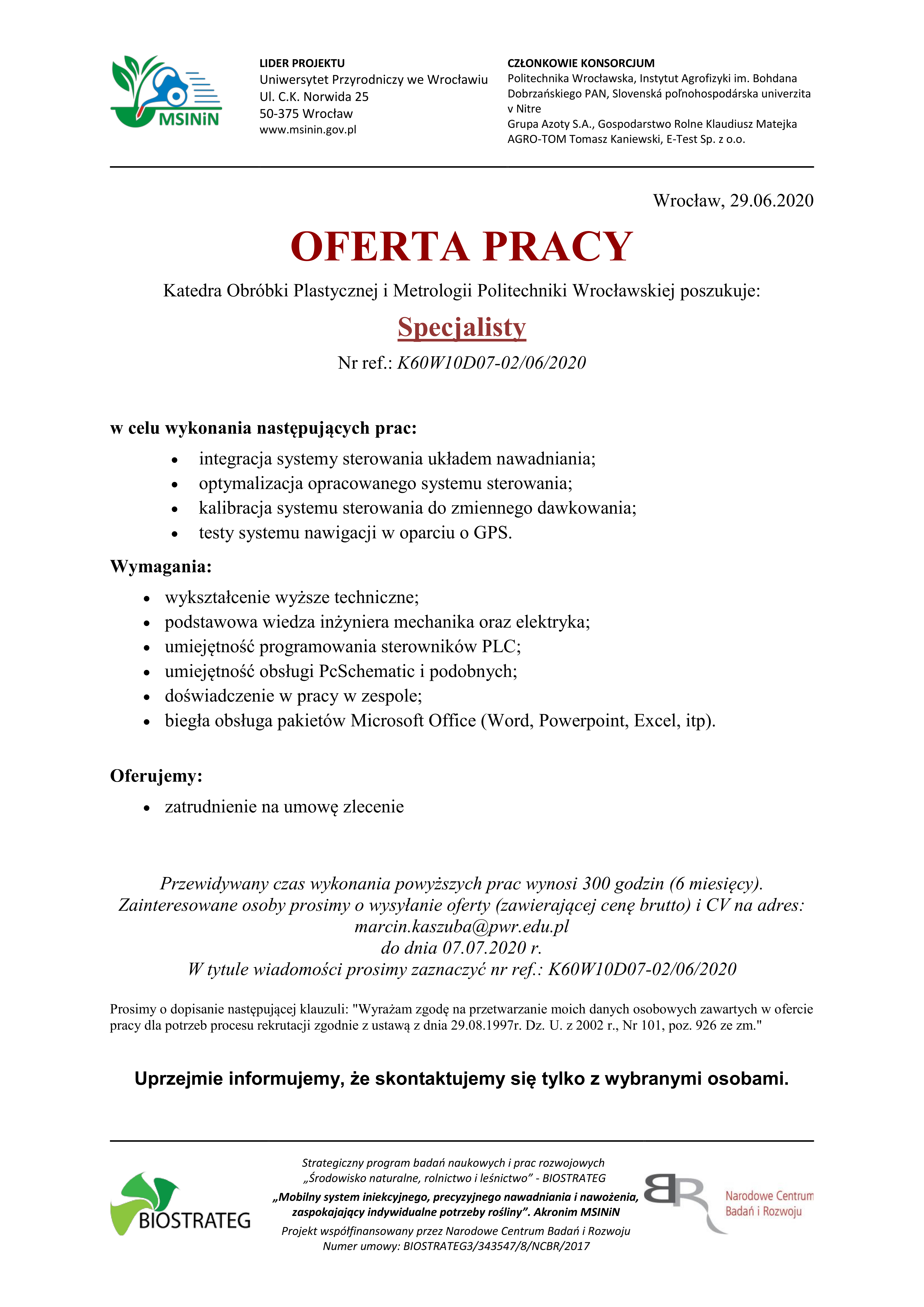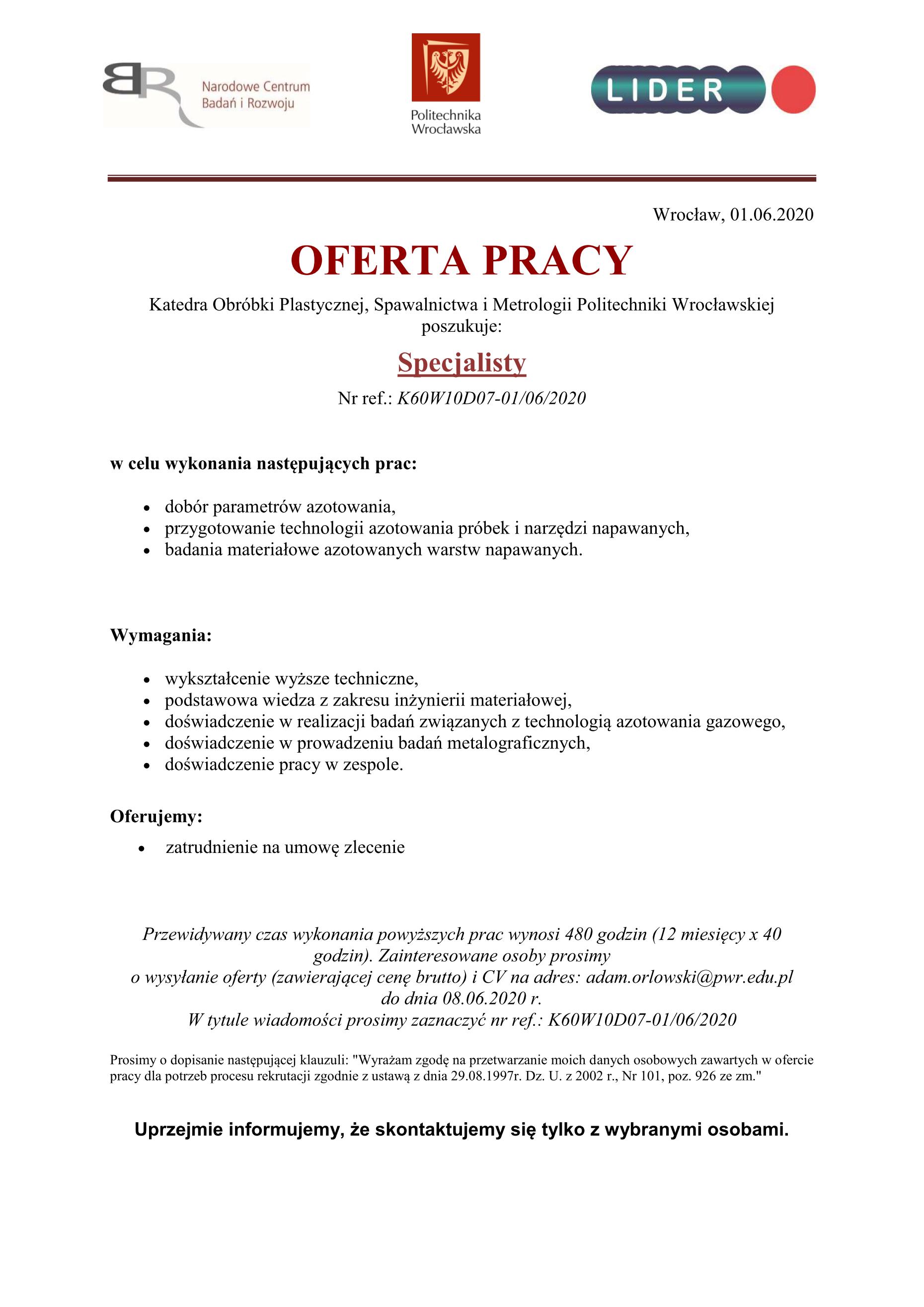 Specjalista - Nr ref.: K60W10D07-01/06/2020