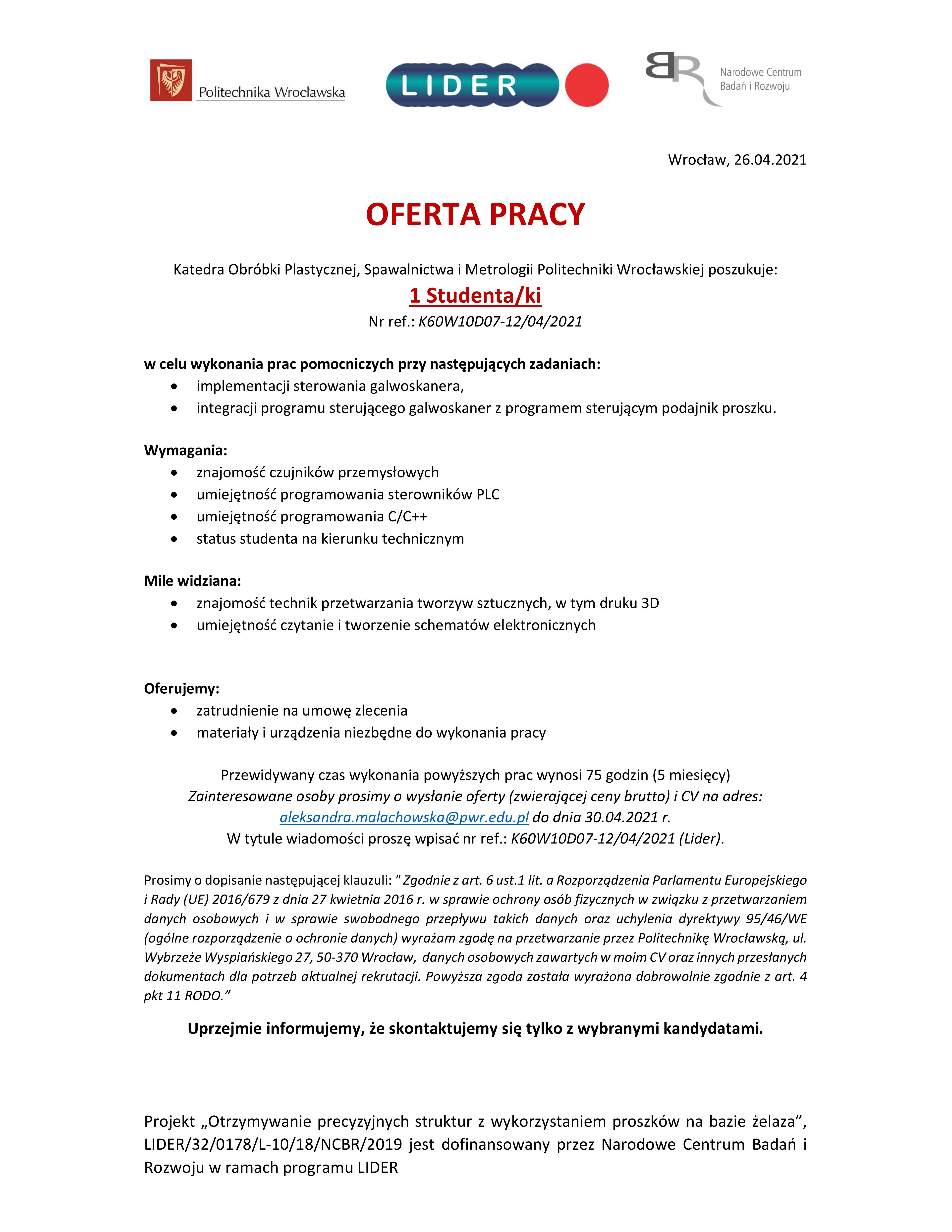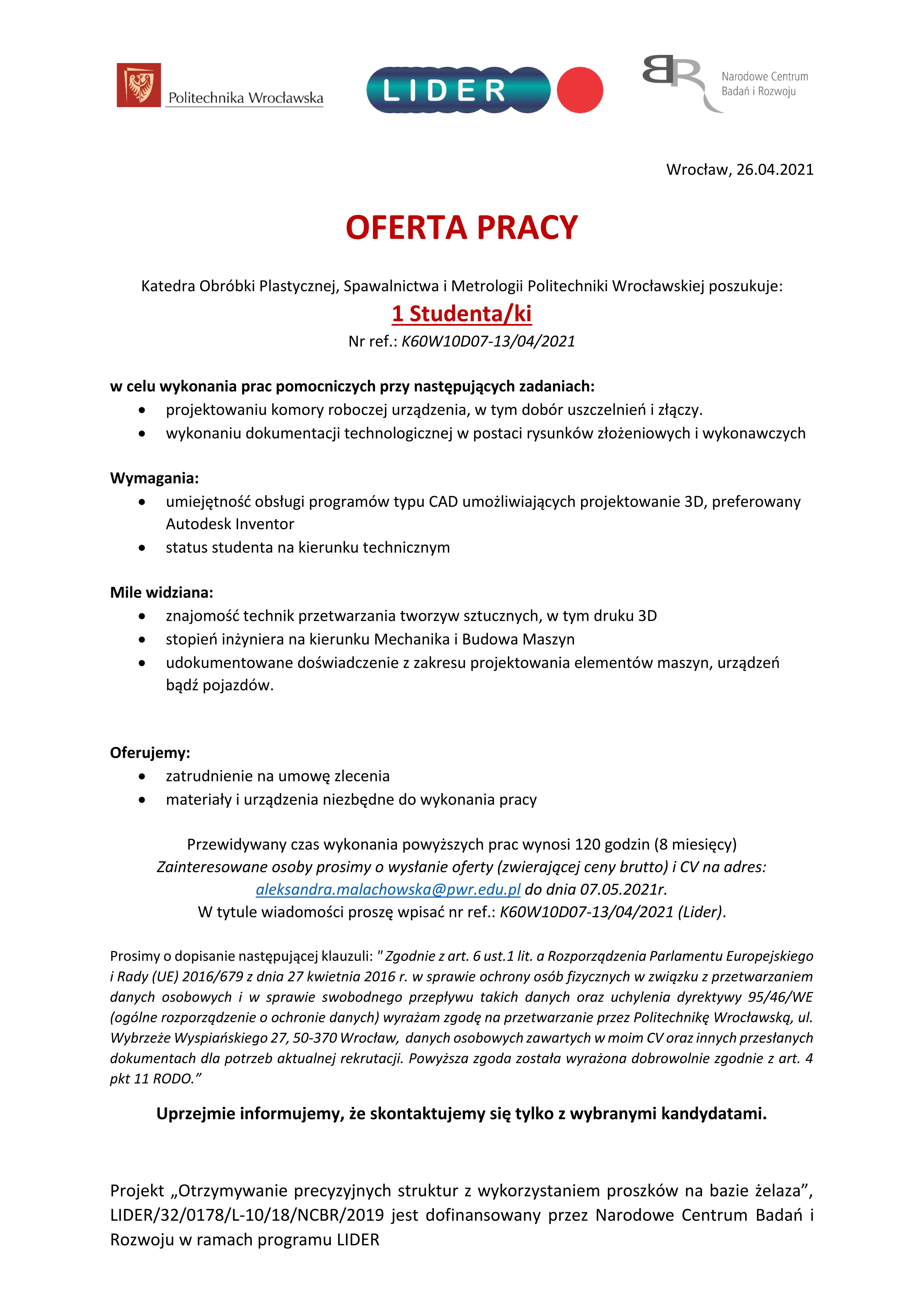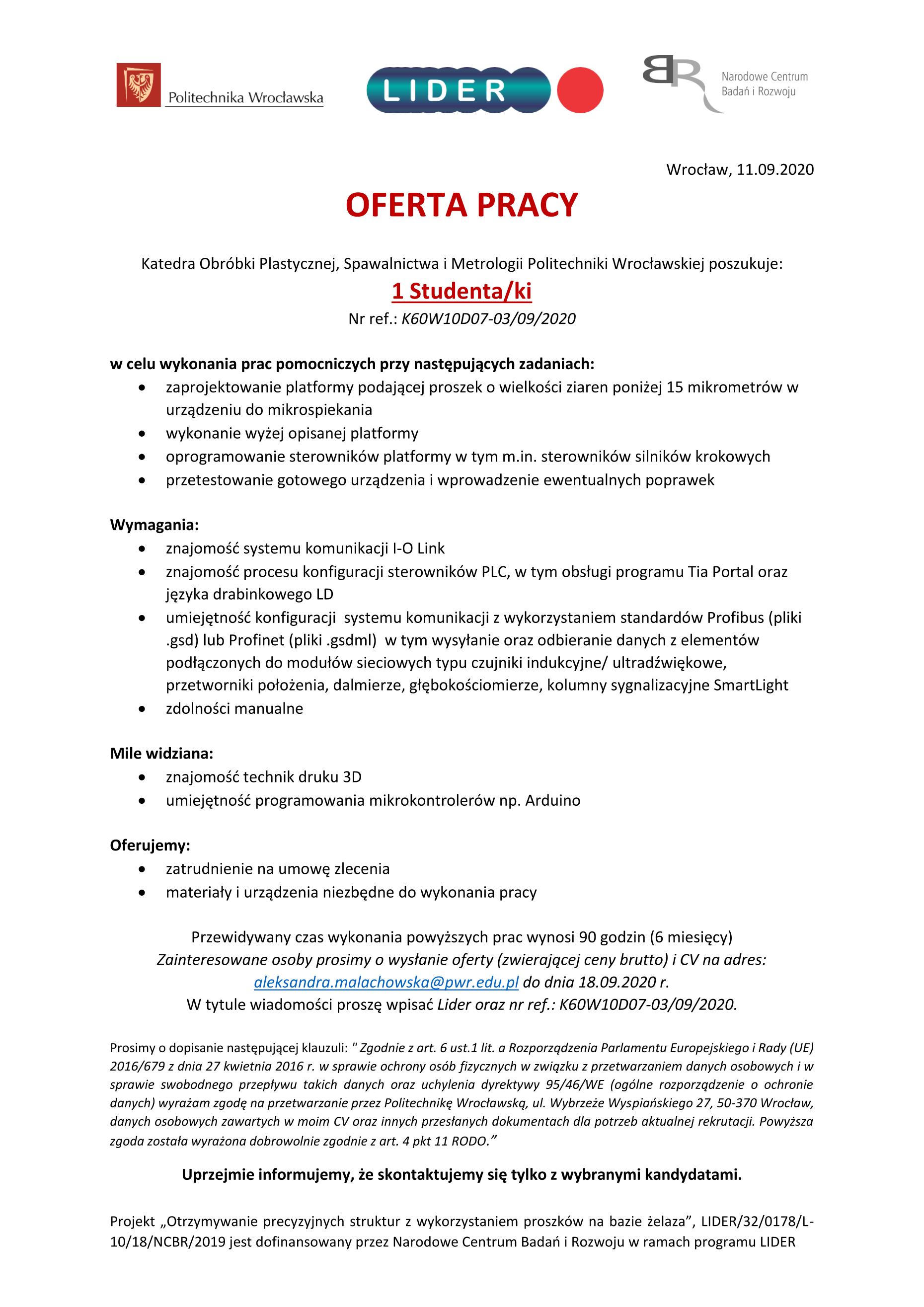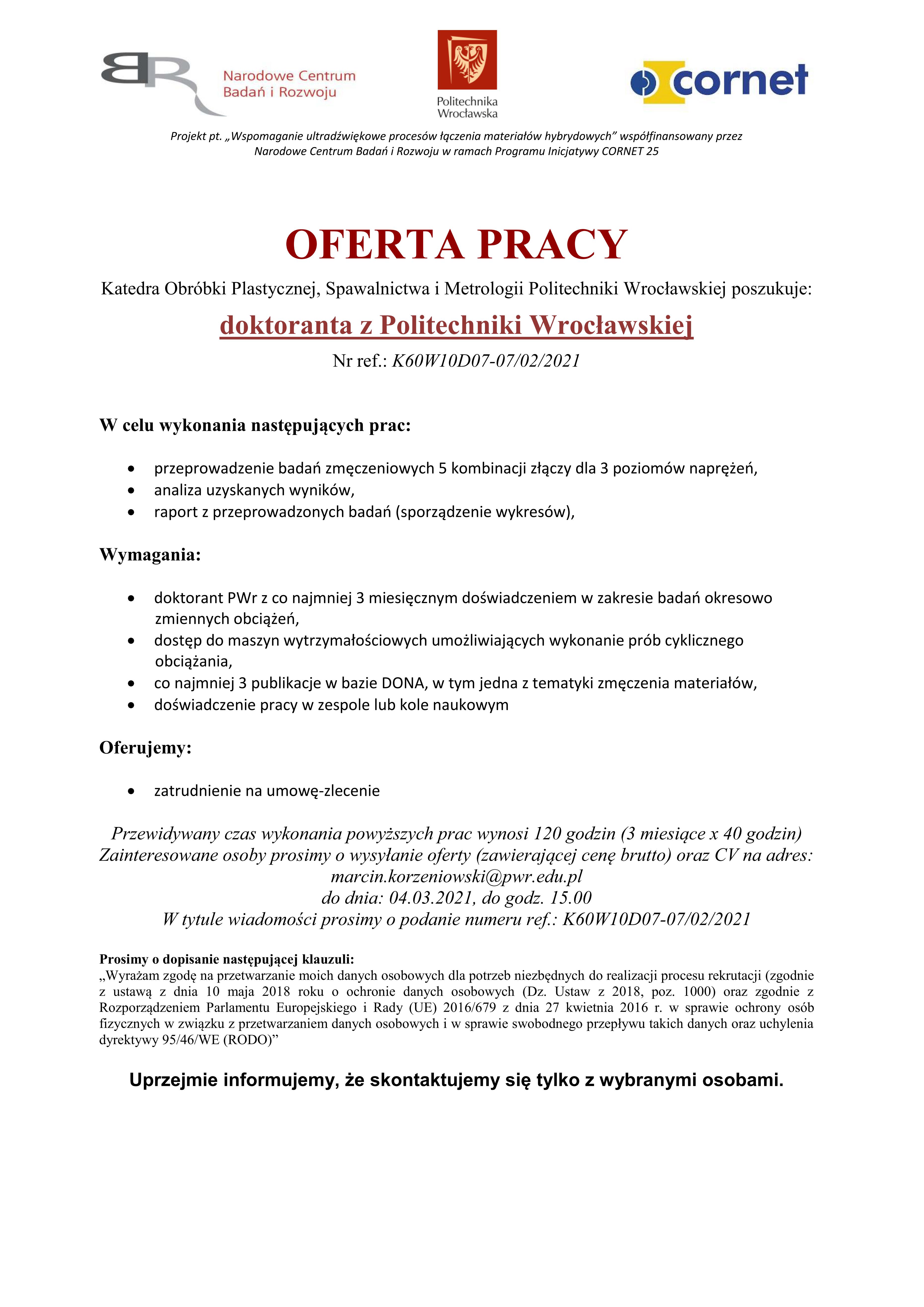 Doktorant Politechniki Wrocławskiej - Nr ref.: K60W10D07-07/02/2021