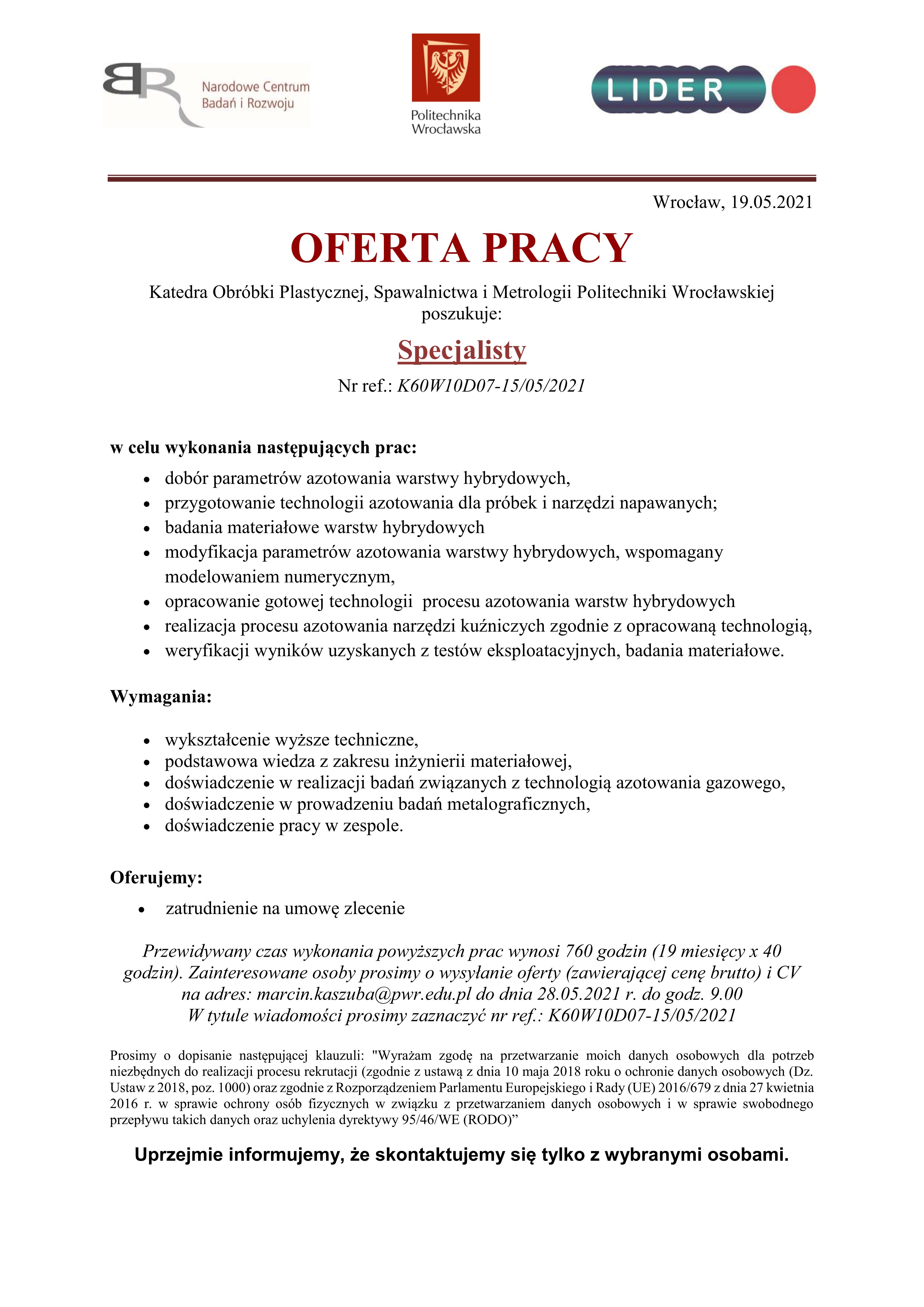 Specjalista - Nr ref.: K60W10D07-15/05/2021