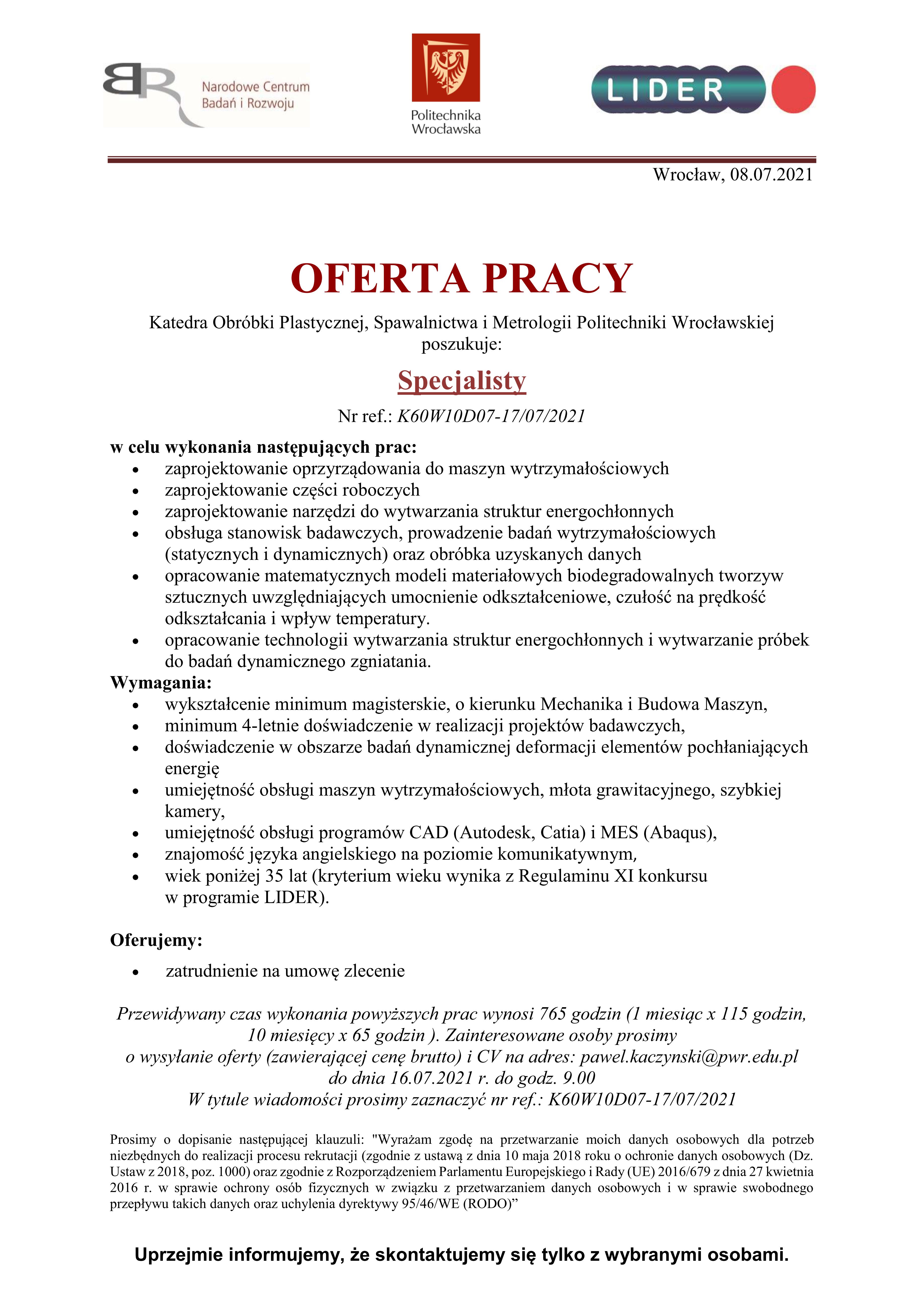 Specjalista - Nr ref.: K60W10D07-17/07/2021