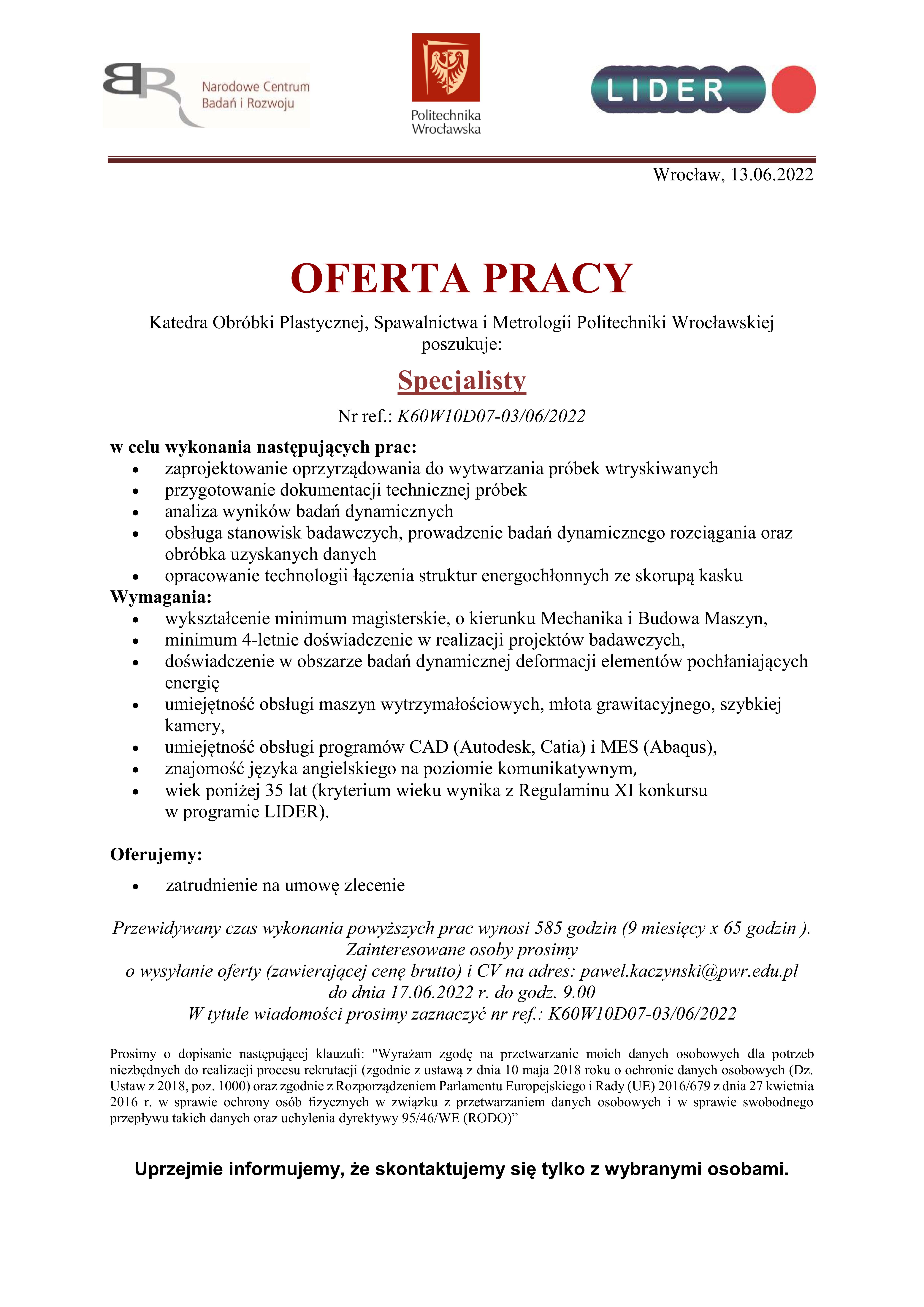 Specjalista - Nr ref.: K60W10D07-03/06/2022