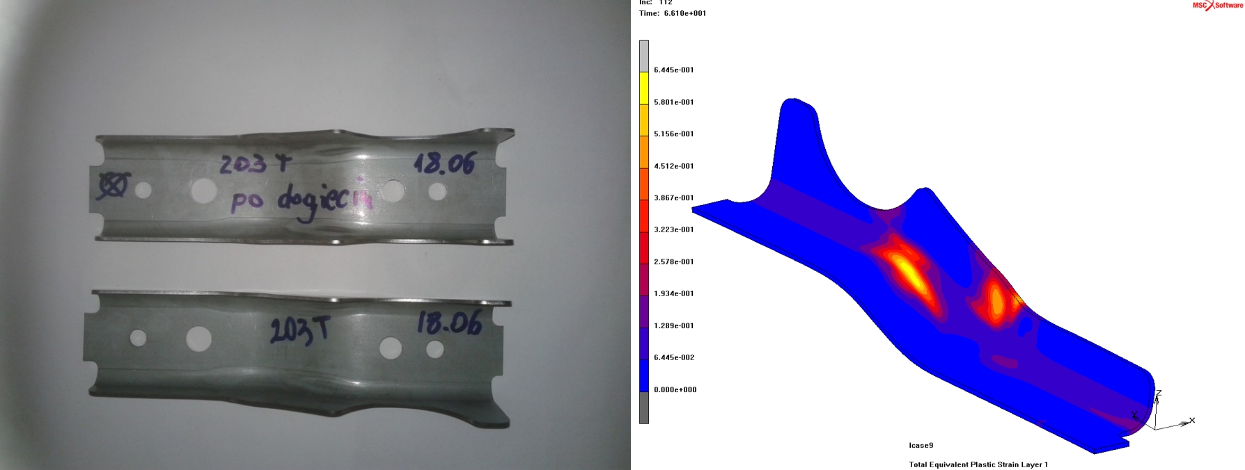 Wynikiem projektu są również zalecenia dla projektowania technologii wytwarzania elementu crashbox celem zwiększenia jego energochłonności oraz elementu wzmacniającego ze stali martenzytycznej. Zalecenia sformułowano w oparciu o symulacje numeryczne procesu tłoczenia tych elementów oraz ich dynamicznego obciążania w teście crash-test. Powstała baza wyników symulacji, która może być wykorzystana przez projektantów elementów nadwozi samochodów do optymalizacji doboru materiału i kształtu wyrobów. Ponadto efektem zrealizowanego projektu jest baza danych materiałowych do wytwarzania półwyrobów i wyrobów na elementy nadwozi samochodowych. Baza zawiera modele reologiczne materiałów badanych w projekcie, graniczne krzywe tłoczności dla tych materiałów oraz wyniki prób wywijania kołnierza i sprężynowania.